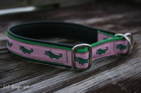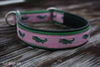 dogs-art Martingale Collar custommade from black leather, green webbing and 7/8" Alligator ribbon in pink/green.